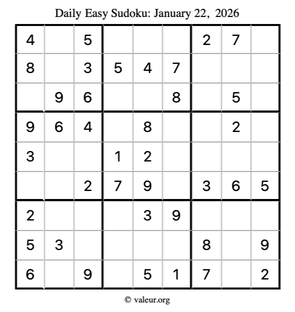 Here is the January 22, 2026 easy sudoku puzzle. You are welcome to print a copy to solve by hand. For your convenience, we have also included the solution further down the page so you can check your work.
