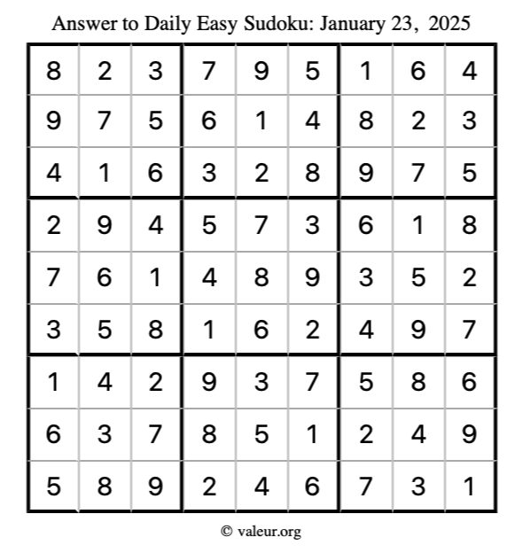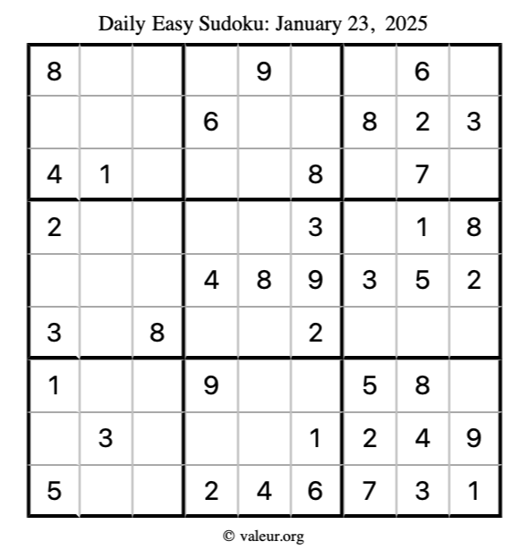 Here is the January 23, 2025 easy sudoku puzzle. You are welcome to print a copy to solve by hand. For your convenience, we have also included the solution further down the page so you can check your work.