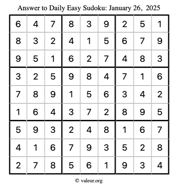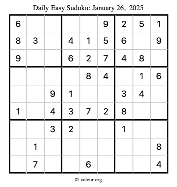 Here is the January 26, 2025 easy sudoku puzzle. You are welcome to print a copy to solve by hand. For your convenience, we have also included the solution further down the page so you can check your work.