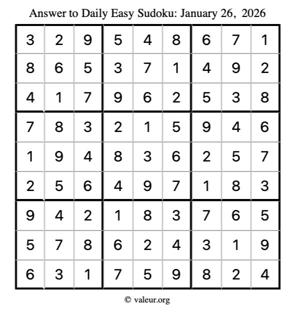 As promised, here is the solution to the January 26, 2026 easy sudoku puzzle: