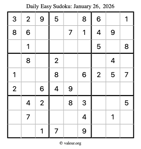 Here is the January 26, 2026 easy sudoku puzzle. You are welcome to print a copy to solve by hand. For your convenience, we have also included the solution further down the page so you can check your work.