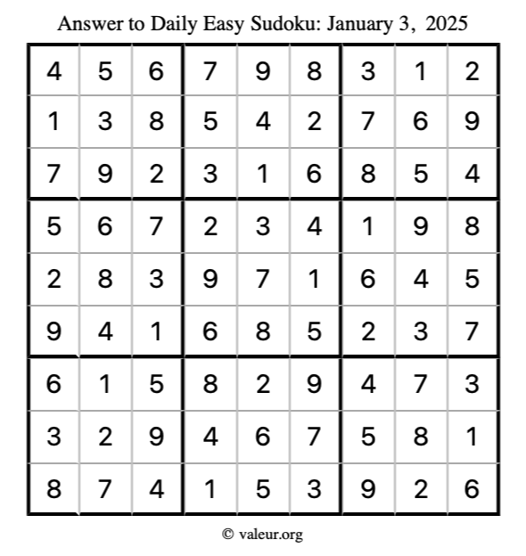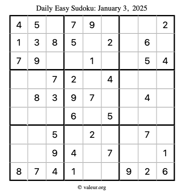Here is the January 3, 2025 easy sudoku puzzle. You are welcome to print a copy to solve by hand. For your convenience, we have also included the solution further down the page so you can check your work.