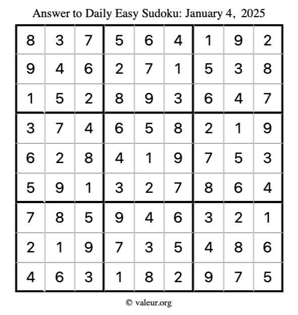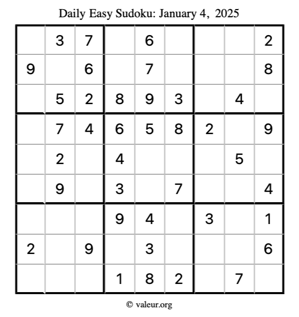 Here is the January 4, 2025 easy sudoku puzzle. You are welcome to print a copy to solve by hand. For your convenience, we have also included the solution further down the page so you can check your work.