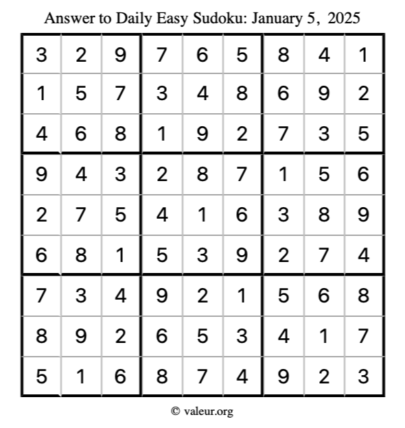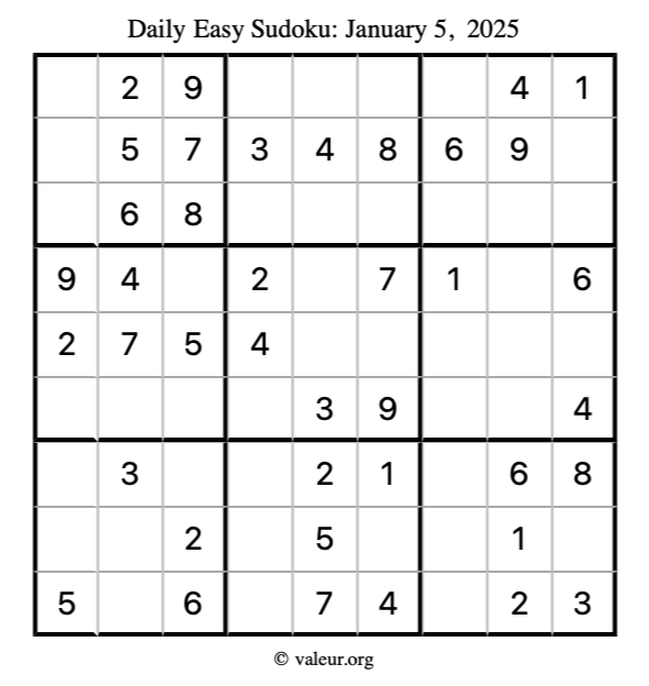 Here is the January 5, 2025 easy sudoku puzzle. You are welcome to print a copy to solve by hand. For your convenience, we have also included the solution further down the page so you can check your work.
