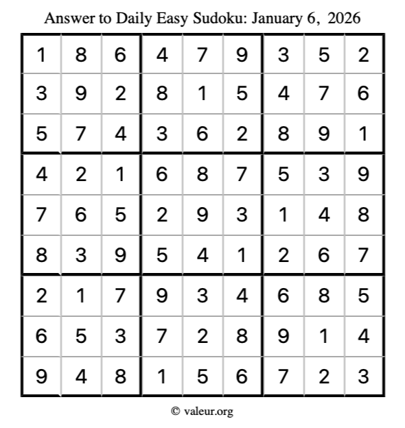 As promised, here is the solution to the January 6, 2026 easy sudoku puzzle: