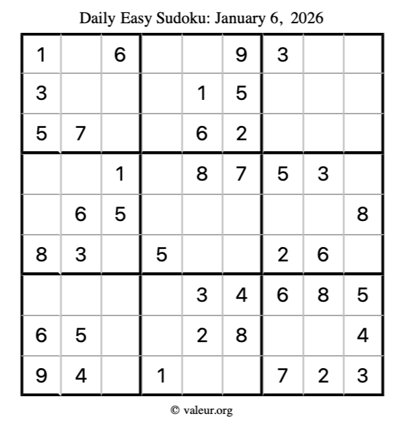 Here is the January 6, 2026 easy sudoku puzzle. You are welcome to print a copy to solve by hand. For your convenience, we have also included the solution further down the page so you can check your work.