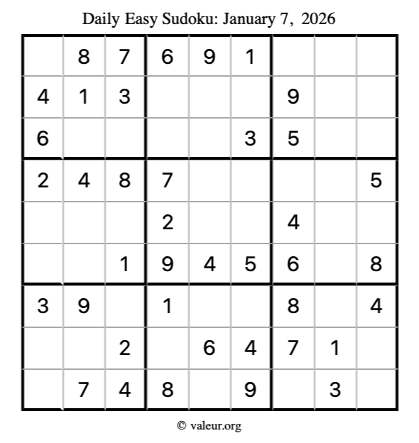 Here is the January 7, 2026 easy sudoku puzzle. You are welcome to print a copy to solve by hand. For your convenience, we have also included the solution further down the page so you can check your work.