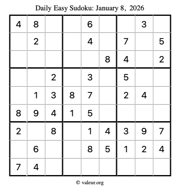 Here is the January 8, 2026 easy sudoku puzzle. You are welcome to print a copy to solve by hand. For your convenience, we have also included the solution further down the page so you can check your work.