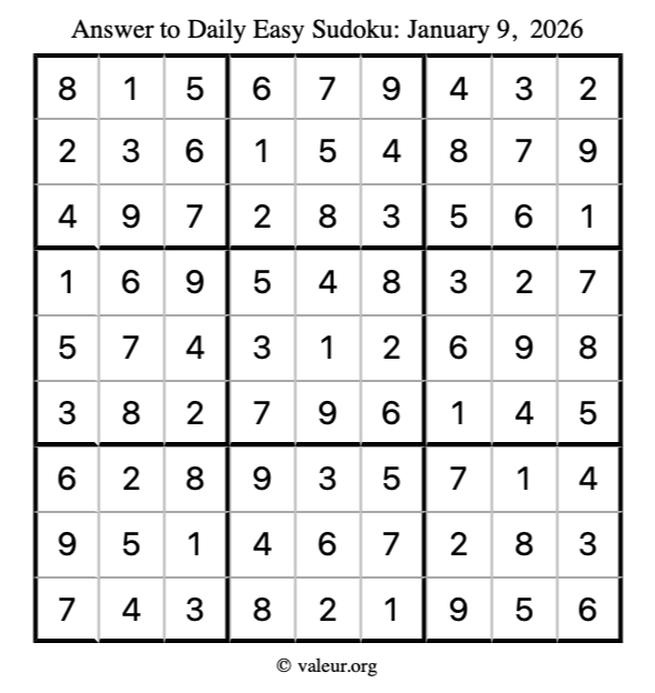 As promised, here is the solution to the January 9, 2026 easy sudoku puzzle: