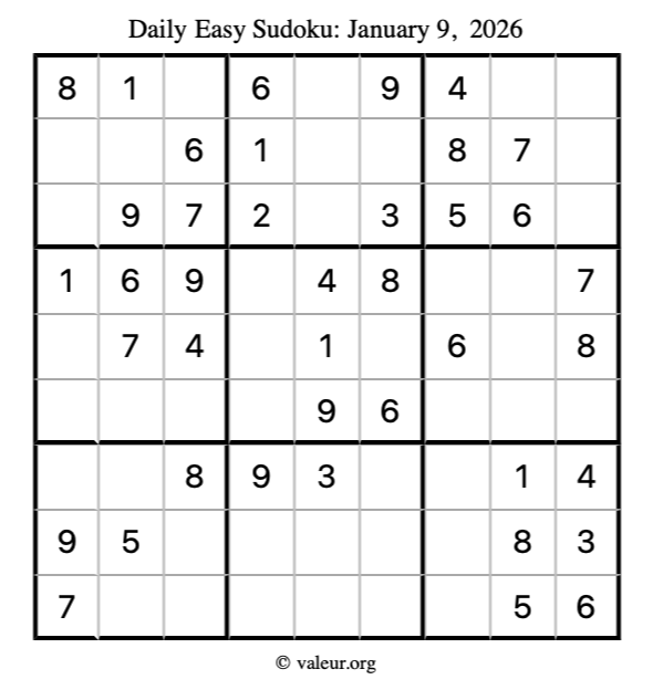 Here is the January 9, 2026 easy sudoku puzzle. You are welcome to print a copy to solve by hand. For your convenience, we have also included the solution further down the page so you can check your work.
