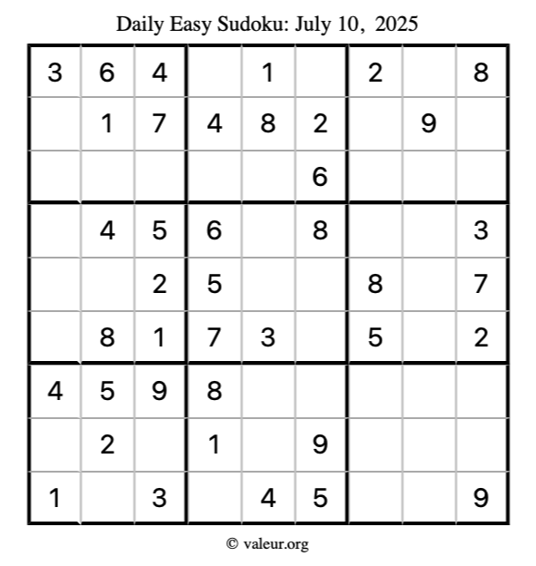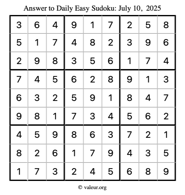Here is the July 10, 2025 easy sudoku puzzle. You are welcome to print a copy to solve by hand. For your convenience, we have also included the solution further down the page so you can check your work.