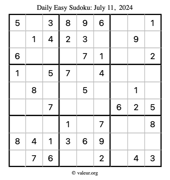 Here is the July 11, 2024 easy sudoku puzzle. You are welcome to print a copy to solve by hand. For your convenience, we have also included the solution further down the page so you can check your work.