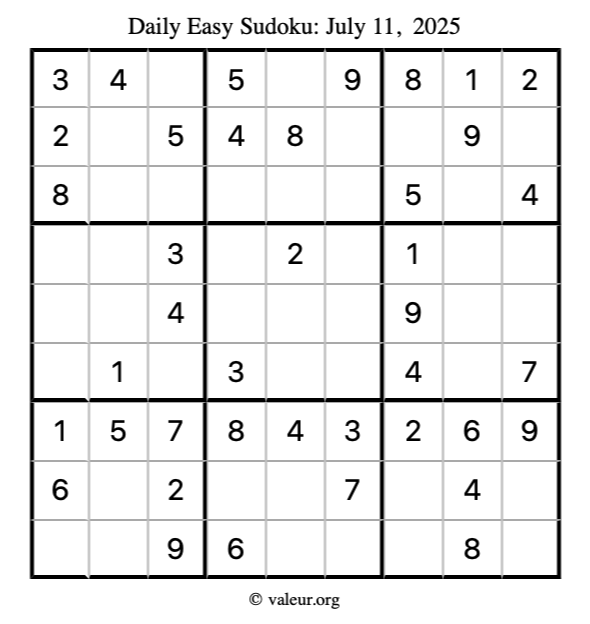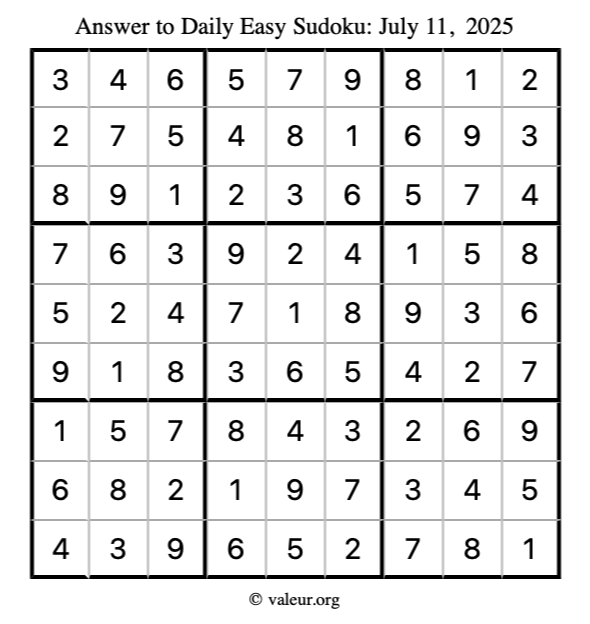 Here is the July 11, 2025 easy sudoku puzzle. You are welcome to print a copy to solve by hand. For your convenience, we have also included the solution further down the page so you can check your work.