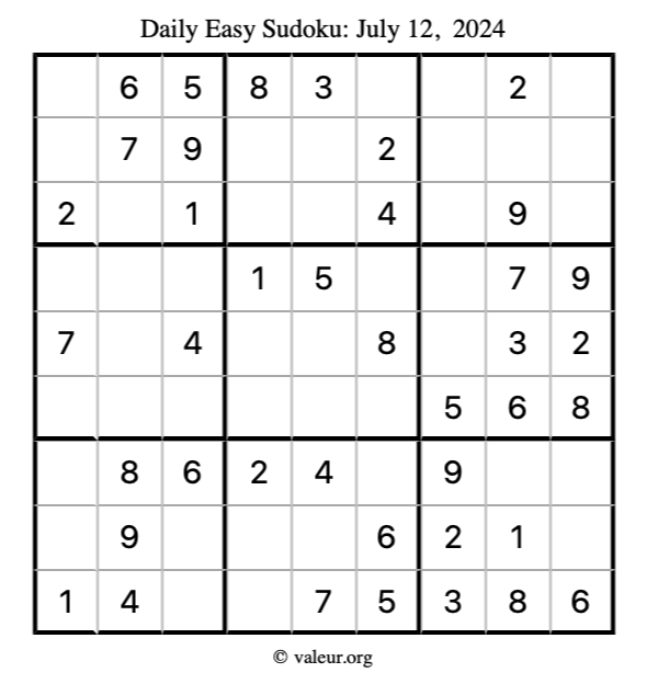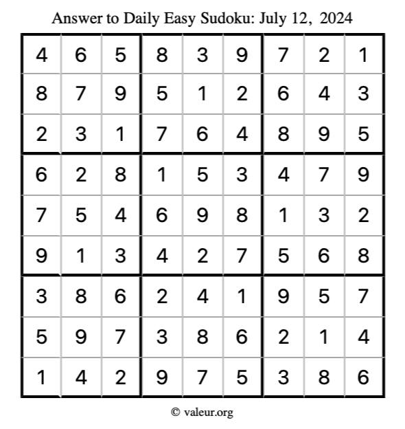 Here is the July 12, 2024 easy sudoku puzzle. You are welcome to print a copy to solve by hand. For your convenience, we have also included the solution further down the page so you can check your work.