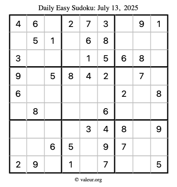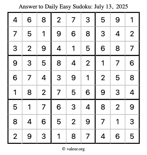 Here is the July 13, 2025 easy sudoku puzzle. You are welcome to print a copy to solve by hand. For your convenience, we have also included the solution further down the page so you can check your work.