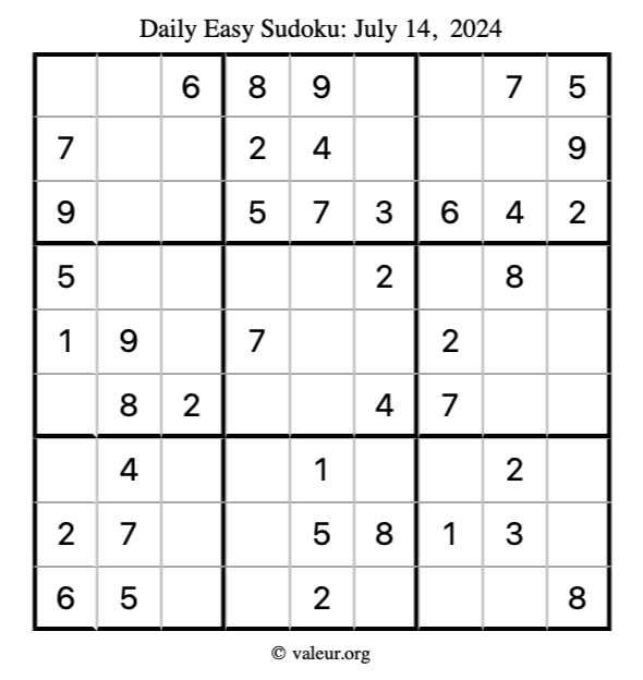 Here is the July 14, 2024 easy sudoku puzzle. You are welcome to print a copy to solve by hand. For your convenience, we have also included the solution further down the page so you can check your work.