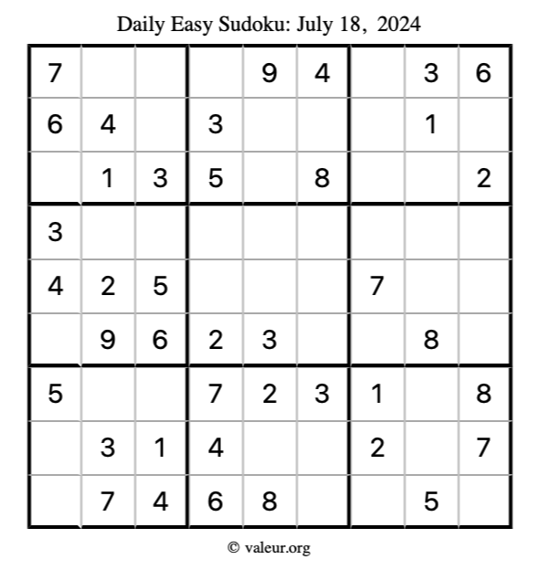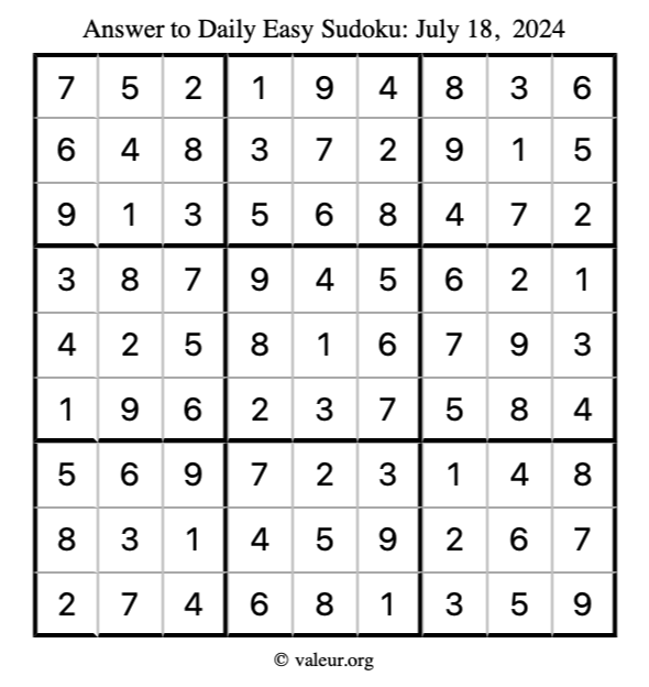 Here is the July 18, 2024 easy sudoku puzzle. You are welcome to print a copy to solve by hand. For your convenience, we have also included the solution further down the page so you can check your work.