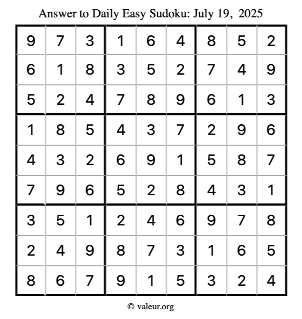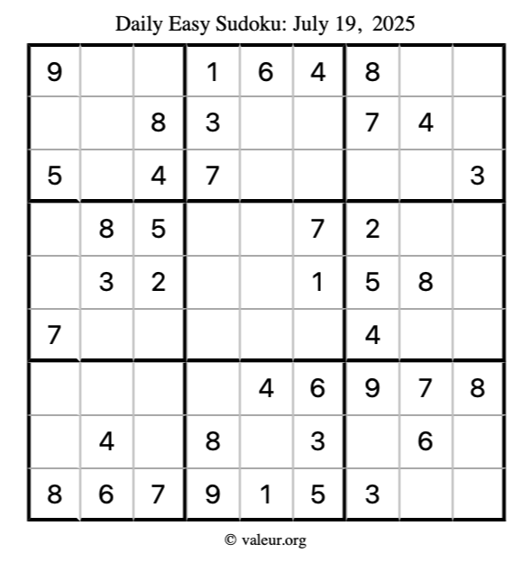 Here is the July 19, 2025 easy sudoku puzzle. You are welcome to print a copy to solve by hand. For your convenience, we have also included the solution further down the page so you can check your work.