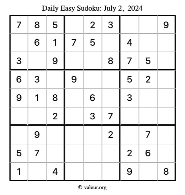 Here is the July 2, 2024 easy sudoku puzzle. You are welcome to print a copy to solve by hand. For your convenience, we have also included the solution further down the page so you can check your work.