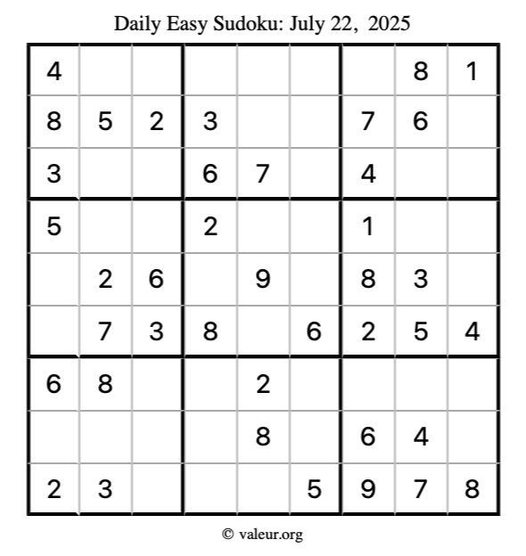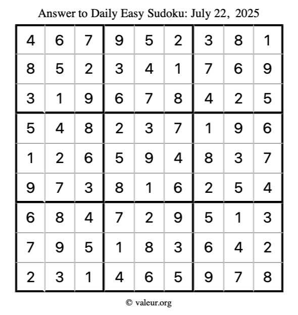 Here is the July 22, 2025 easy sudoku puzzle. You are welcome to print a copy to solve by hand. For your convenience, we have also included the solution further down the page so you can check your work.