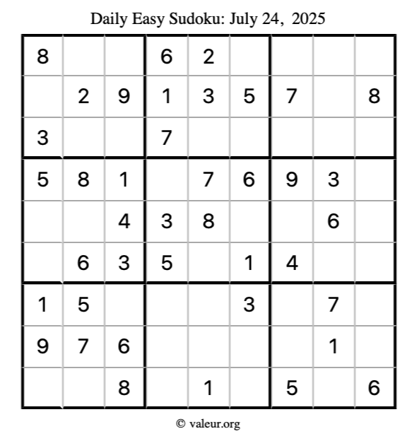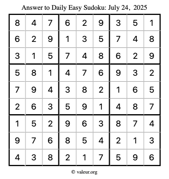 Here is the July 24, 2025 easy sudoku puzzle. You are welcome to print a copy to solve by hand. For your convenience, we have also included the solution further down the page so you can check your work.