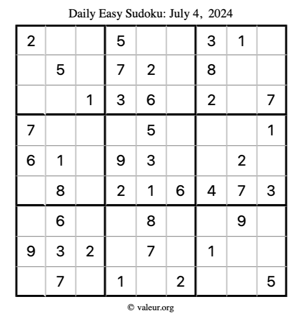 Here is the July 4, 2024 easy sudoku puzzle. You are welcome to print a copy to solve by hand. For your convenience, we have also included the solution further down the page so you can check your work.