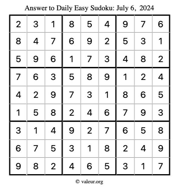 Here is the July 6, 2024 easy sudoku puzzle. You are welcome to print a copy to solve by hand. For your convenience, we have also included the solution further down the page so you can check your work.
