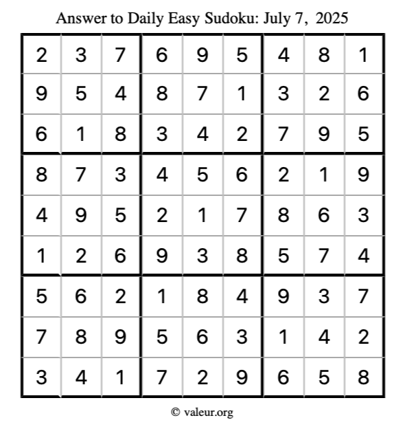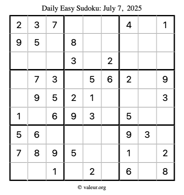 Here is the July 7, 2025 easy sudoku puzzle. You are welcome to print a copy to solve by hand. For your convenience, we have also included the solution further down the page so you can check your work.