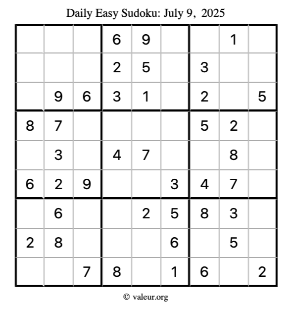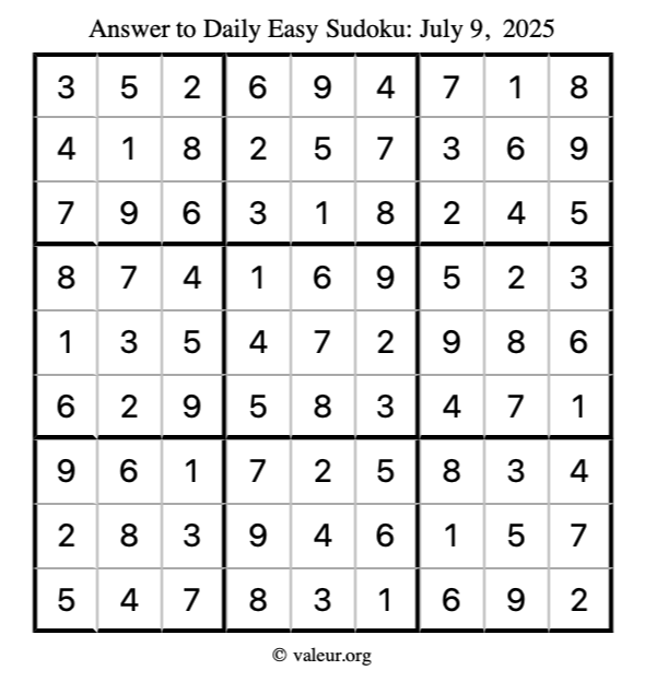 Here is the July 9, 2025 easy sudoku puzzle. You are welcome to print a copy to solve by hand. For your convenience, we have also included the solution further down the page so you can check your work.