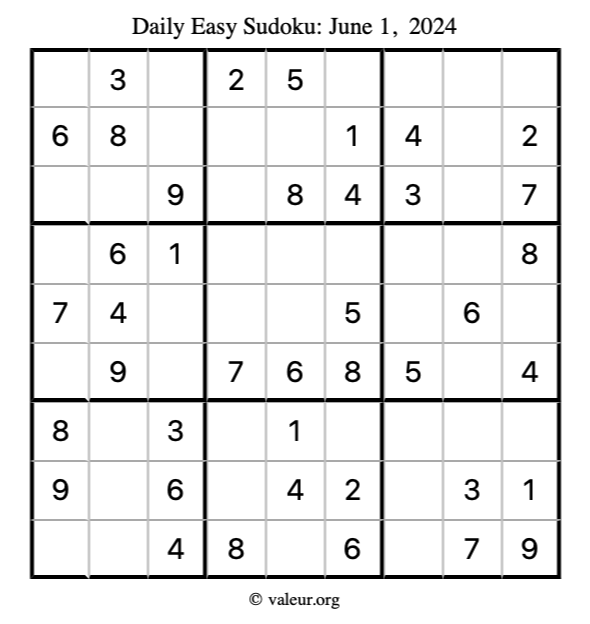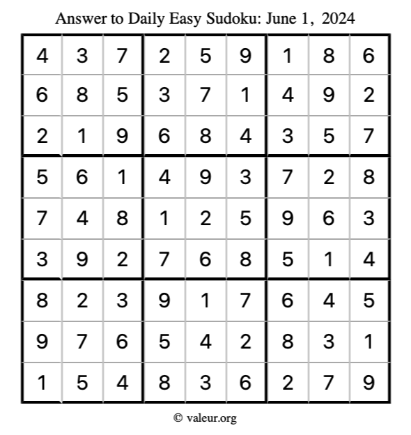 Here is the June 1, 2024 easy sudoku puzzle. You are welcome to print a copy to solve by hand. For your convenience, we have also included the solution further down the page so you can check your work.