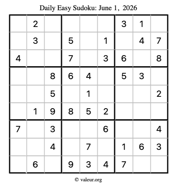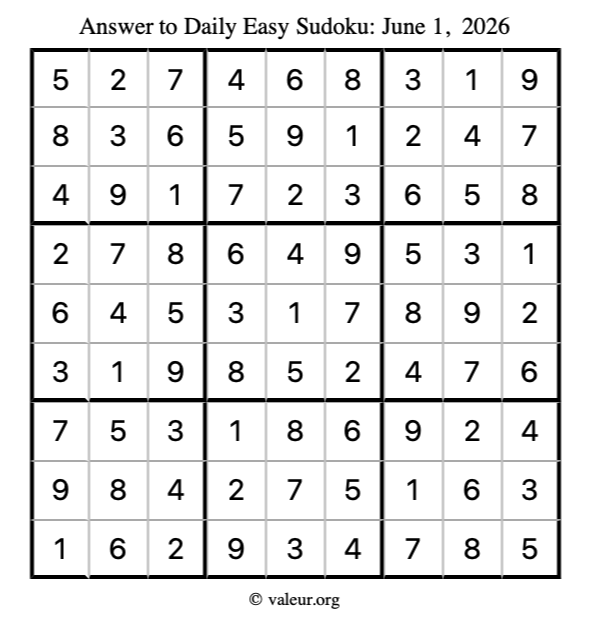 Here is the June 1, 2026 easy sudoku puzzle. You are welcome to print a copy to solve by hand. For your convenience, we have also included the solution further down the page so you can check your work.
