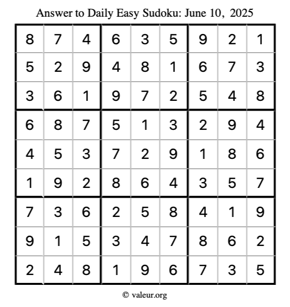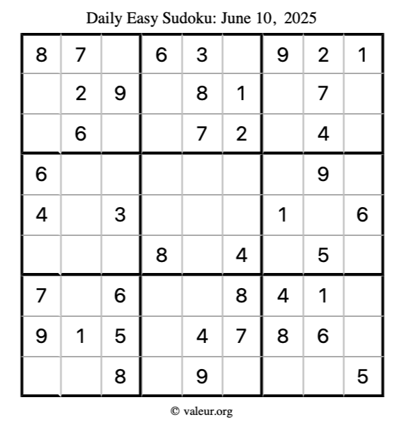 Here is the June 10, 2025 easy sudoku puzzle. You are welcome to print a copy to solve by hand. For your convenience, we have also included the solution further down the page so you can check your work.