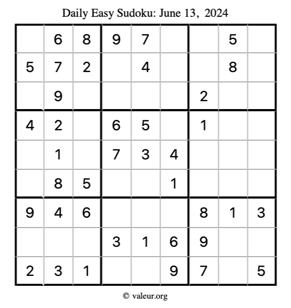 Here is the June 13, 2024 easy sudoku puzzle. You are welcome to print a copy to solve by hand. For your convenience, we have also included the solution further down the page so you can check your work.