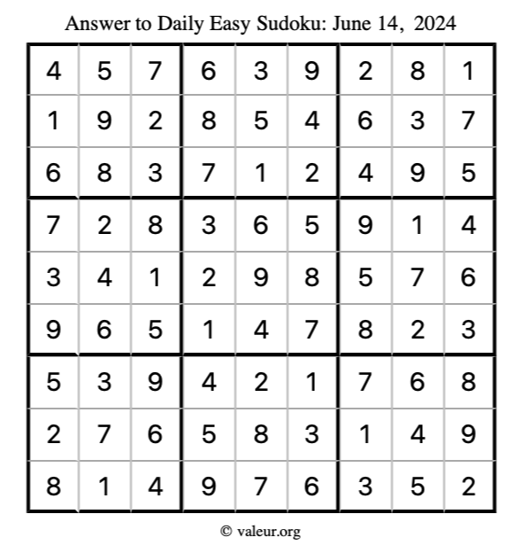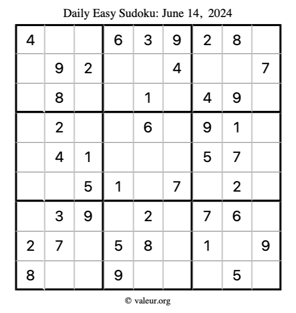 Here is the June 14, 2024 easy sudoku puzzle. You are welcome to print a copy to solve by hand. For your convenience, we have also included the solution further down the page so you can check your work.