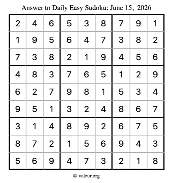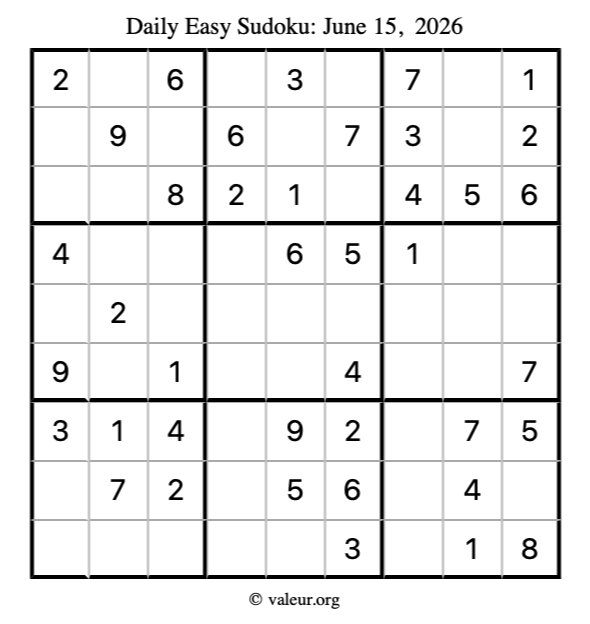 Here is the June 15, 2026 easy sudoku puzzle. You are welcome to print a copy to solve by hand. For your convenience, we have also included the solution further down the page so you can check your work.
