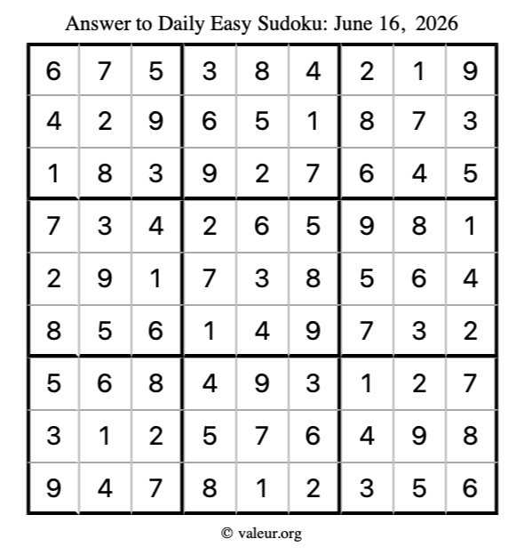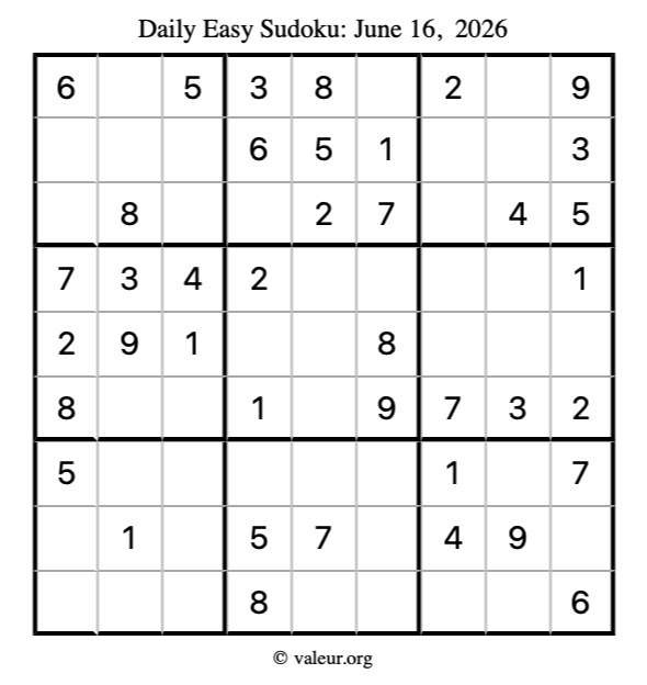 Here is the June 16, 2026 easy sudoku puzzle. You are welcome to print a copy to solve by hand. For your convenience, we have also included the solution further down the page so you can check your work.