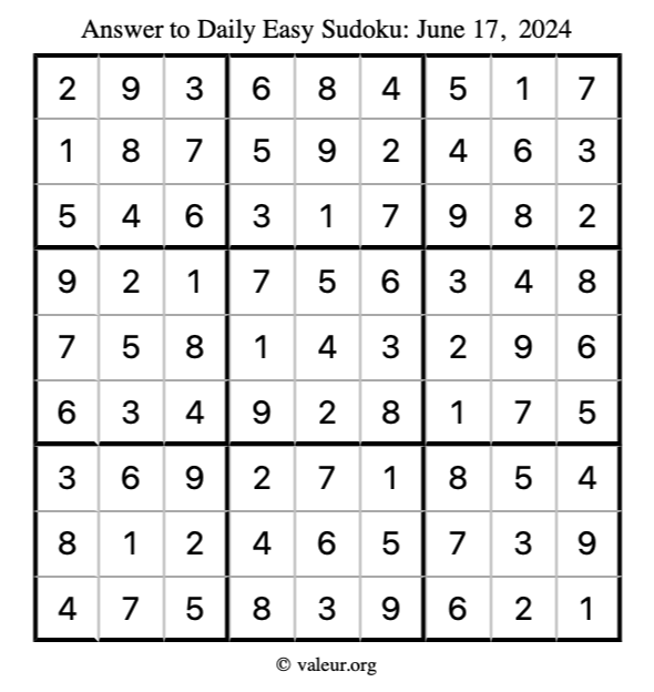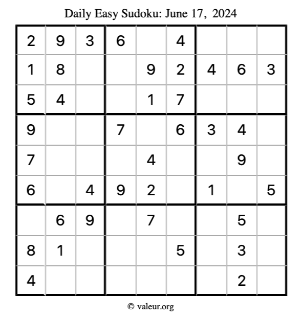 Here is the June 17, 2024 easy sudoku puzzle. You are welcome to print a copy to solve by hand. For your convenience, we have also included the solution further down the page so you can check your work.