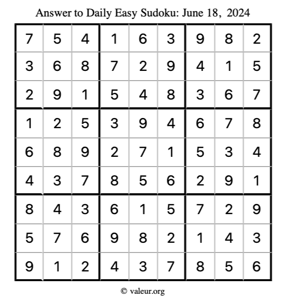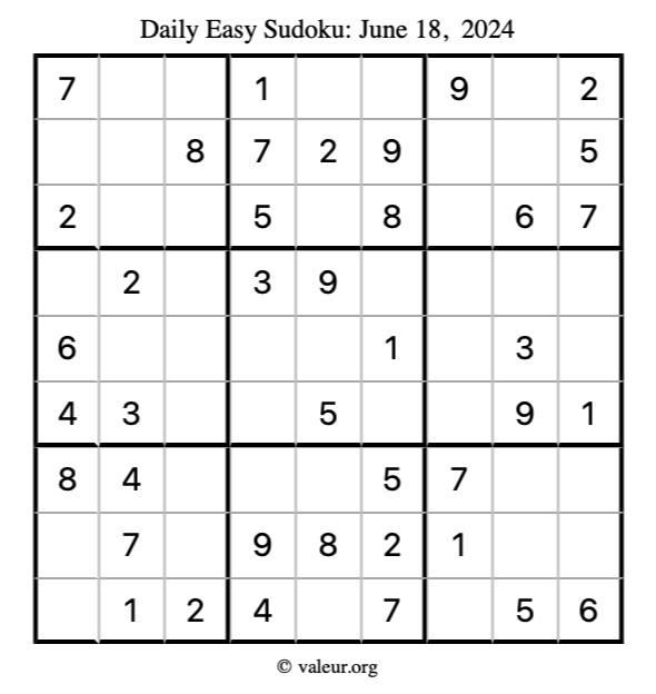 Here is the June 18, 2024 easy sudoku puzzle. You are welcome to print a copy to solve by hand. For your convenience, we have also included the solution further down the page so you can check your work.