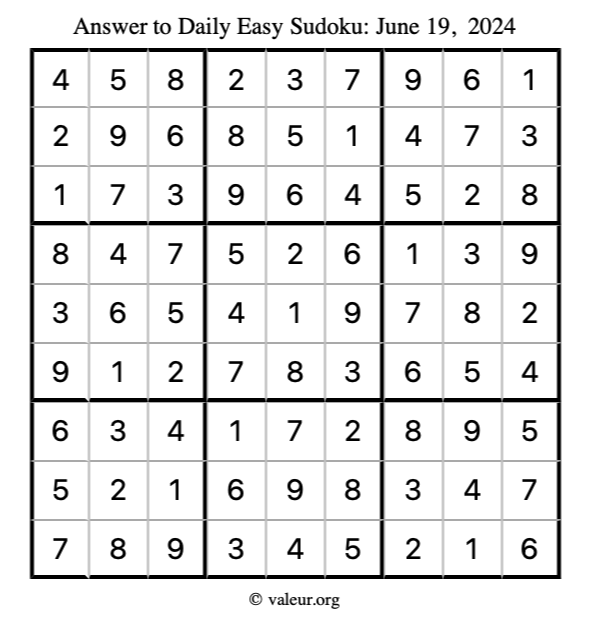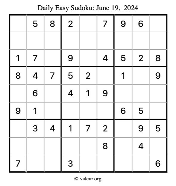 Here is the June 19, 2024 easy sudoku puzzle. You are welcome to print a copy to solve by hand. For your convenience, we have also included the solution further down the page so you can check your work.