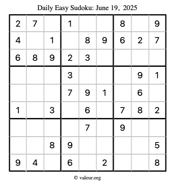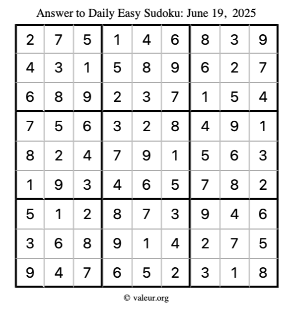 Here is the June 19, 2025 easy sudoku puzzle. You are welcome to print a copy to solve by hand. For your convenience, we have also included the solution further down the page so you can check your work.