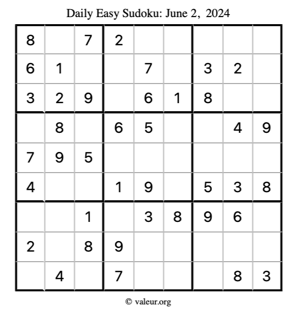 Here is the June 2, 2024 easy sudoku puzzle. You are welcome to print a copy to solve by hand. For your convenience, we have also included the solution further down the page so you can check your work.