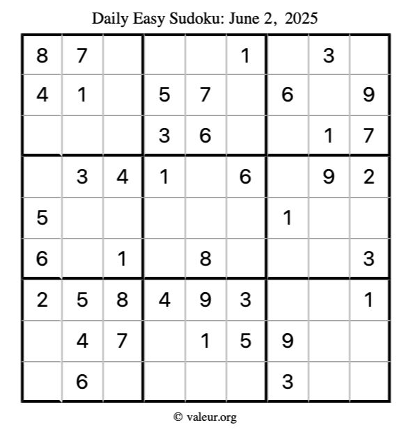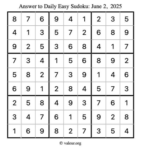 Here is the June 2, 2025 easy sudoku puzzle. You are welcome to print a copy to solve by hand. For your convenience, we have also included the solution further down the page so you can check your work.