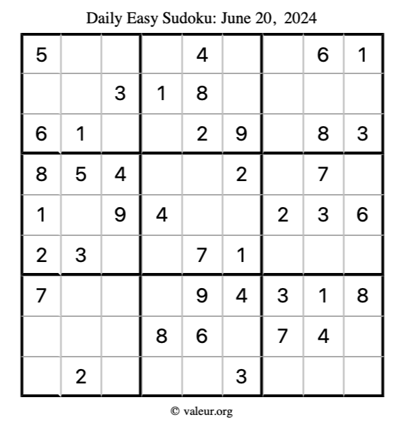 Here is the June 20, 2024 easy sudoku puzzle. You are welcome to print a copy to solve by hand. For your convenience, we have also included the solution further down the page so you can check your work.