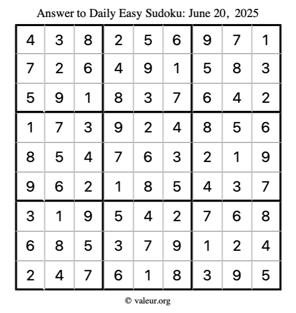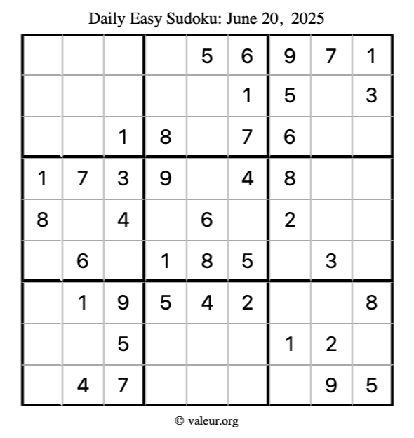 Here is the June 20, 2025 easy sudoku puzzle. You are welcome to print a copy to solve by hand. For your convenience, we have also included the solution further down the page so you can check your work.