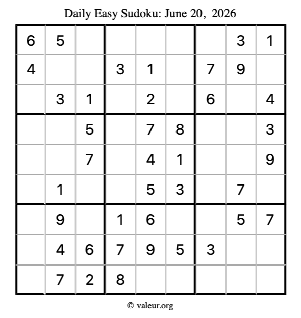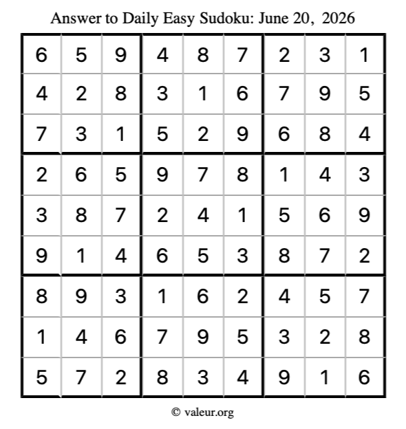 Here is the June 20, 2026 easy sudoku puzzle. You are welcome to print a copy to solve by hand. For your convenience, we have also included the solution further down the page so you can check your work.