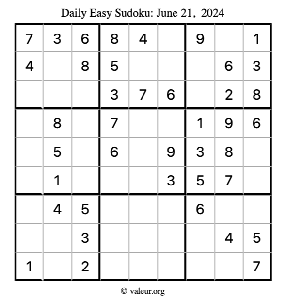 Here is the June 21, 2024 easy sudoku puzzle. You are welcome to print a copy to solve by hand. For your convenience, we have also included the solution further down the page so you can check your work.