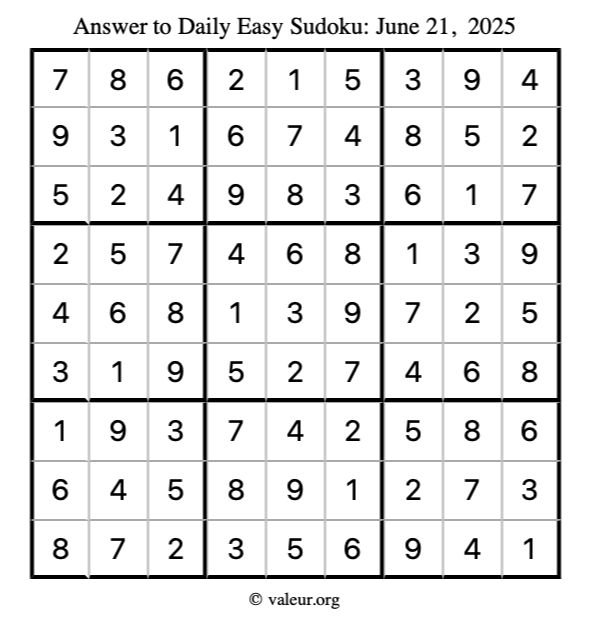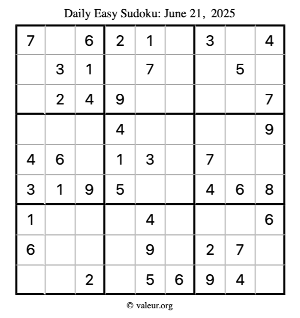 Here is the June 21, 2025 easy sudoku puzzle. You are welcome to print a copy to solve by hand. For your convenience, we have also included the solution further down the page so you can check your work.