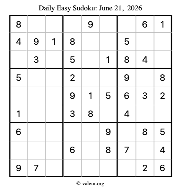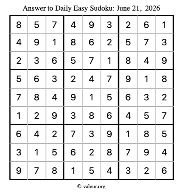 Here is the June 21, 2026 easy sudoku puzzle. You are welcome to print a copy to solve by hand. For your convenience, we have also included the solution further down the page so you can check your work.