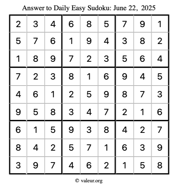Here is the June 22, 2025 easy sudoku puzzle. You are welcome to print a copy to solve by hand. For your convenience, we have also included the solution further down the page so you can check your work.