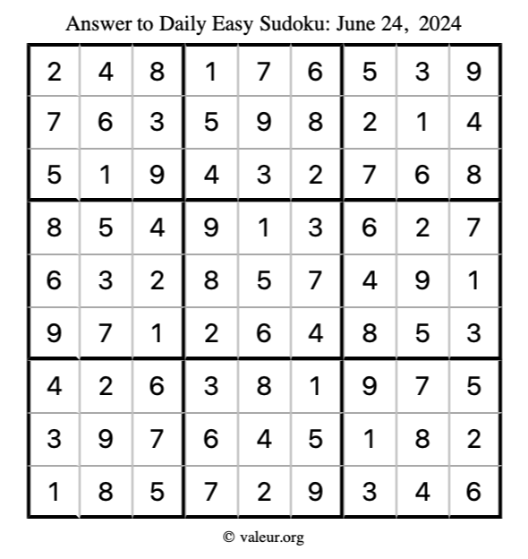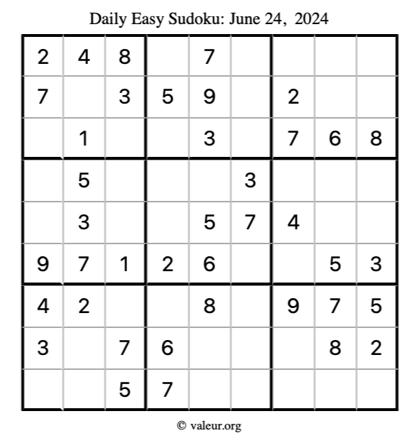 Here is the June 24, 2024 easy sudoku puzzle. You are welcome to print a copy to solve by hand. For your convenience, we have also included the solution further down the page so you can check your work.